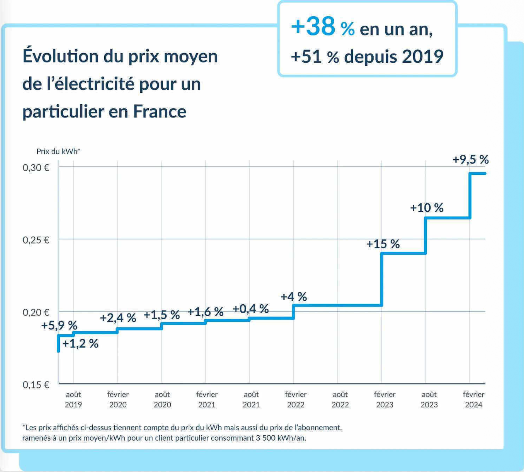 Consommer directement le courant que vous produisez fera baisser le montant de votre facture d’électricité. En effet, le prix du Kwh ne cesse d’augmenter au minimum 15% par an .