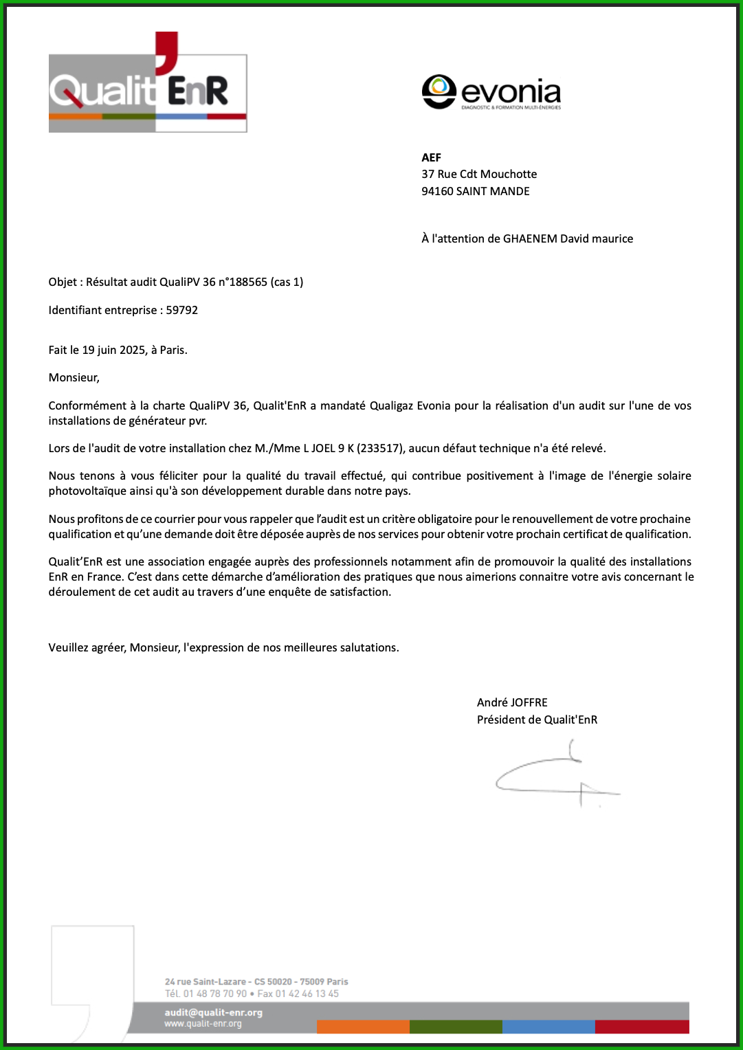 AEF se soumet à des audits sur ses chantiers régulièrement visité par Qualit'EnR qui vérifie les installations photovoltaïques au point de vue étude de production , administratif et technique. AEF bénéficie à ce titre du label Audit vert qui signifie que les chantier controlés sont conformes aux cahier des charges imposé par Qualit'EnR dans le respect de la charte du Label RGE .